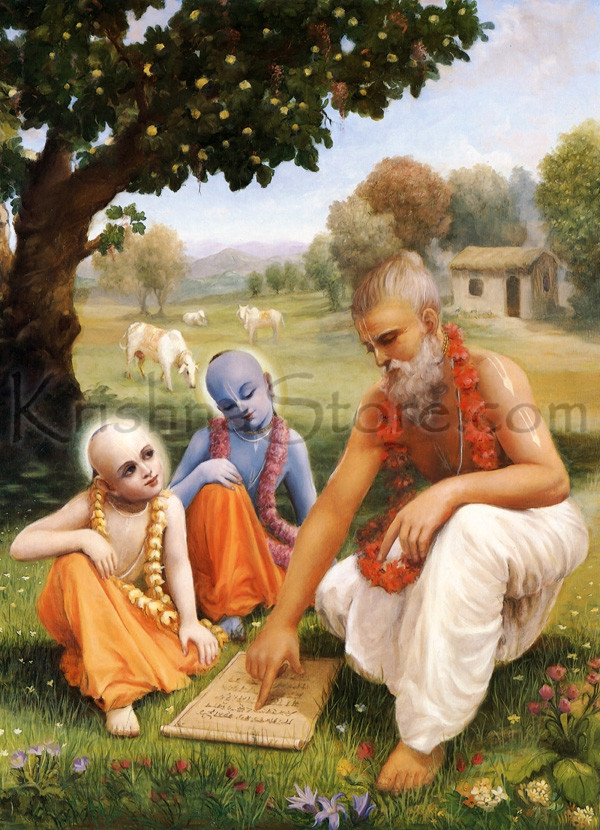 குருவுக்கு நமஸ்காரம் செய்து, நீர் மல்க கிருஷ்ணன் சாந்திபனி முனி ஸ்ரேஷ்டர் முன் நின்றான்.